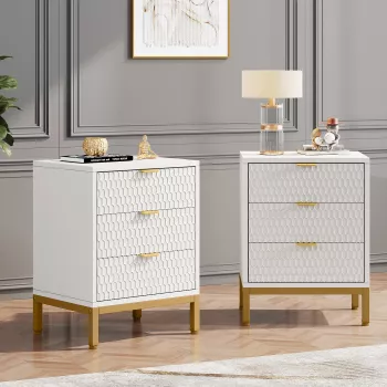 2-Pack Modern White & Gold Nightstands with 3 Drawers – Contemporary Tall Bedside Tables