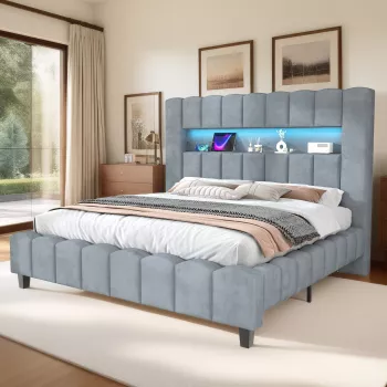 Upholstered Queen Bed with LED Headboard, Storage & Charging