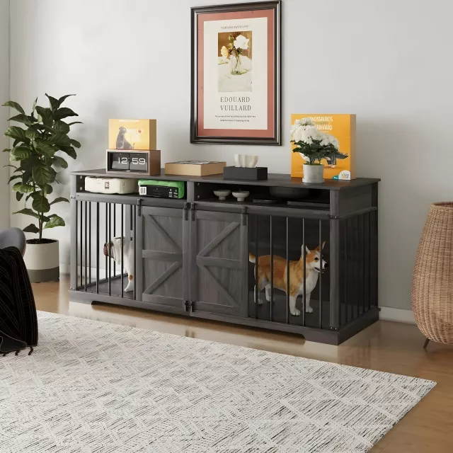 A sliding barn door adds rustic charm and effortless functionality. It moves smoothly for quick access and features a safety latch to prevent accidental escapes. The included divider gives you the flexibility to house two dogs separately or remove it for a larger shared space.