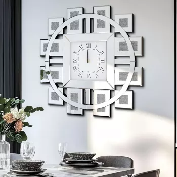Large 31.5” Crushed Diamond Mirrored Wall Clock – Silver & Gold Glam Decor