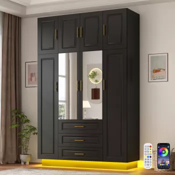 Large 4-Door Armoire Wardrobe Closet with Drawers and LED Lights