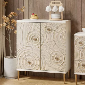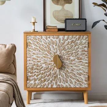 Boho Hand-Carved Sunburst Accent Cabinet with Gold Handles – Modern Storage