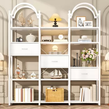 83.5″ Tall Modern Arched Bookshelf with 13 Shelves & 3 Drawers – Large Industrial Display Shelf
