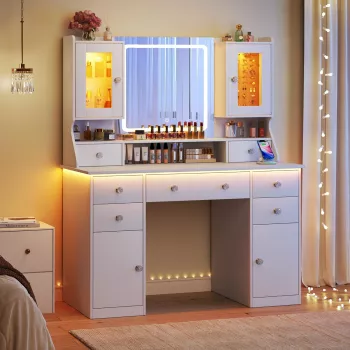 42’’ White Vanity Desk with Lighted Mirror, RGB Cabinets & 7 Drawers