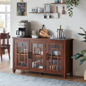 Large Farmhouse Sideboard Buffet Cabinet with Glass Doors & Adjustable Storage – 55” Rustic Wood Coffee Bar