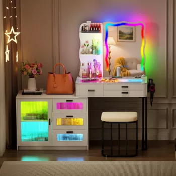 Vanity Desk with Mirror & RGB Lights – Makeup Table with Charging Station